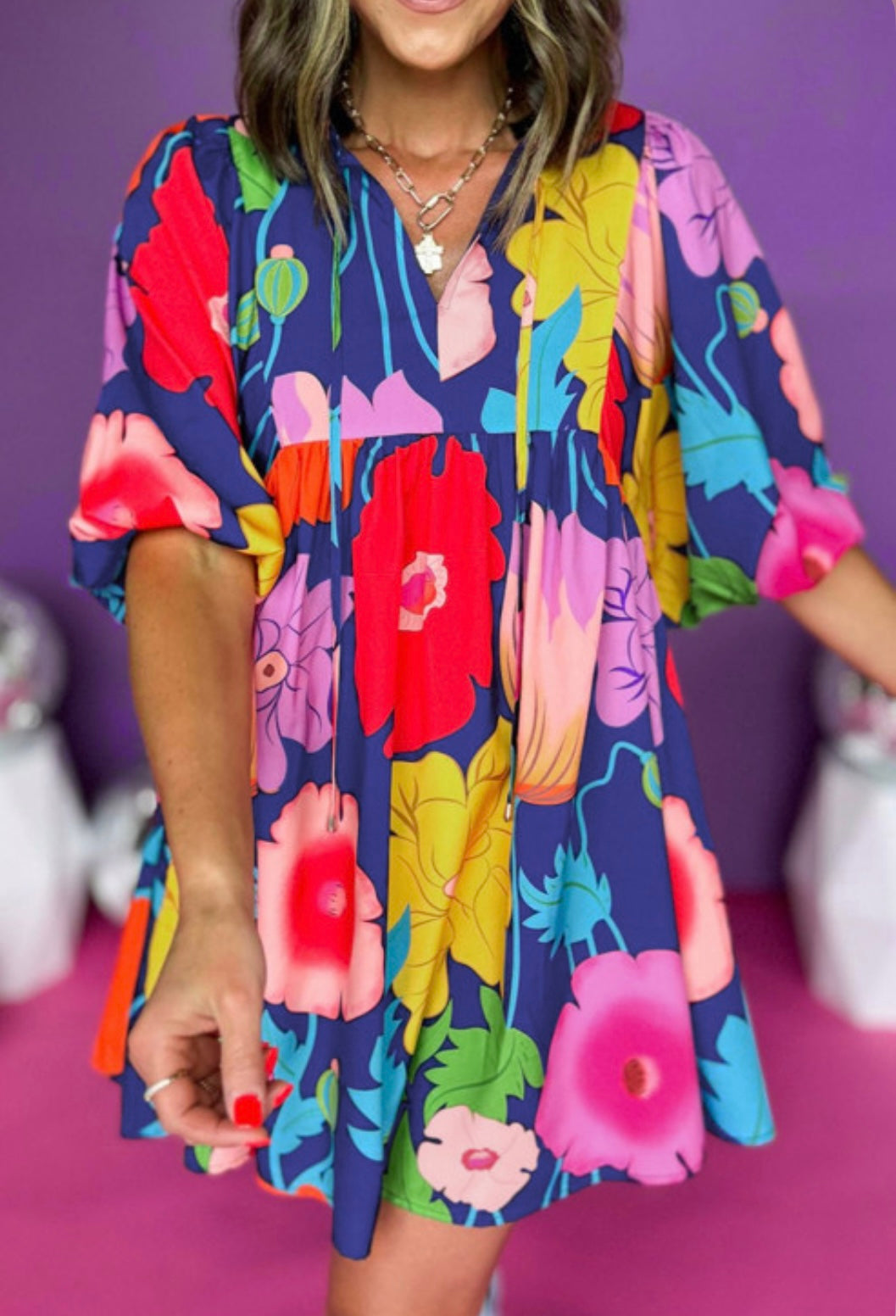 Dark Blue Floral Babydoll Dress